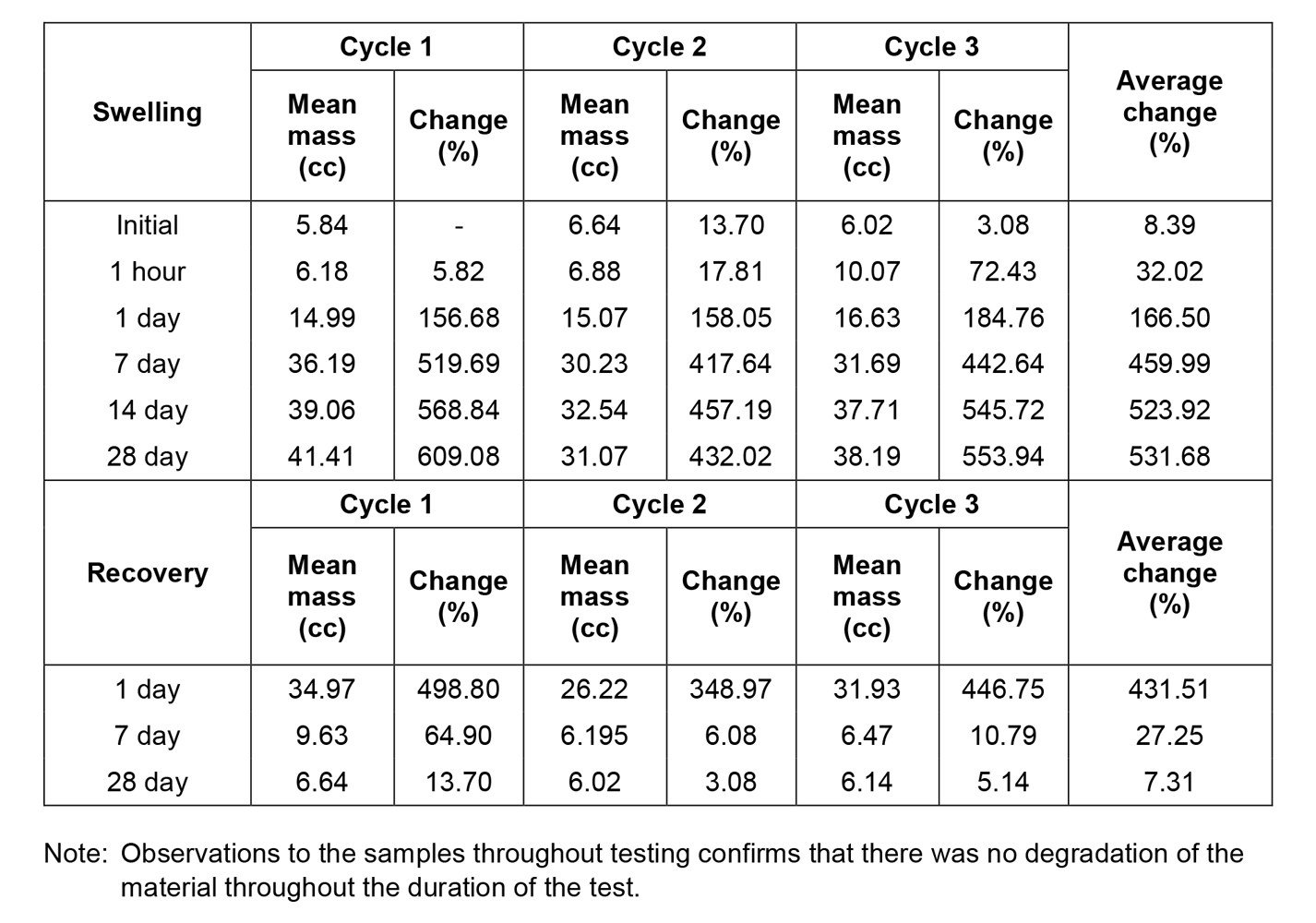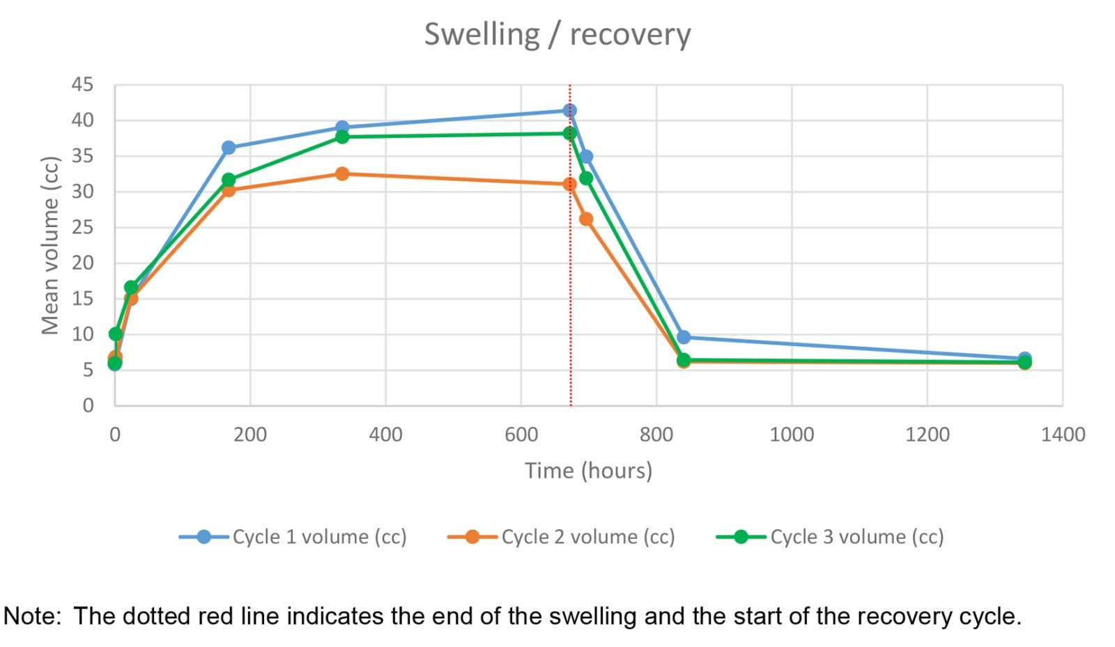 The increase in volume was measured when specimens were immersed in tap water at 23°C over a 28 day period. Recovery volume was measured when the specimens were removed from the solution and air dried over a 28 day period. This method was repeated over three cycles. The percentage change in volume calculations are all based on the initial volume.Â