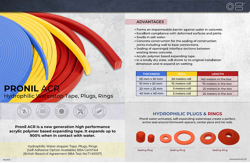 New generation high performance waterstops which expanding up to 900% when in contact with water.Pronil ACR is a new generation high performance acrylic polymer based expanding tape. It expands up to 900% when in contact with water. In a totally dry state, Pronil ACR will shrink to it’s original installation dimension and re-expand on wetting. Pronil ACR is used in concrete construction for the sealing of construction joints including wall to base connections, pipe entry systems, sealing of openings and interface sections between existing and new concrete. Pronil ACR is easily stored in it’s original moisture-proof wrap in cool, dry conditions away from sunlight.