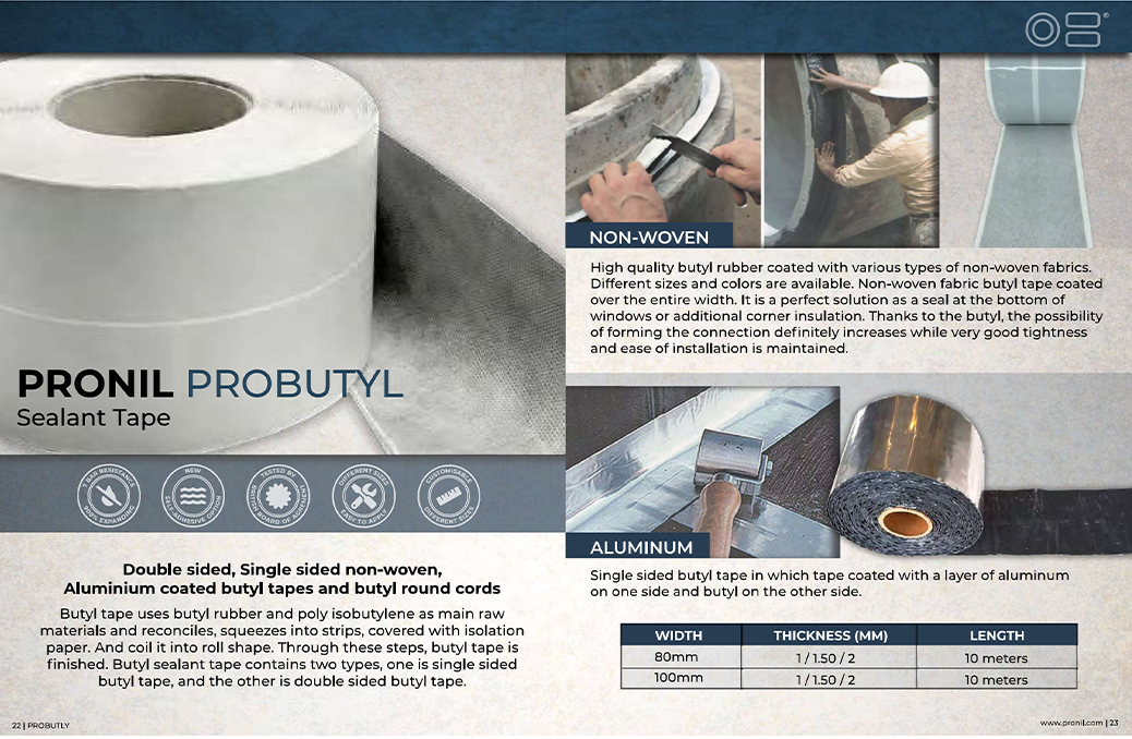 Pronil Probutyl refers to a high-performance butyl-based sealing and waterproofing material commonly used in construction, HVAC, automotive, and industrial applications. Made from premium-grade butyl rubber compounds, it offers superior adhesion, excellent flexibility, and long-lasting sealing capability.