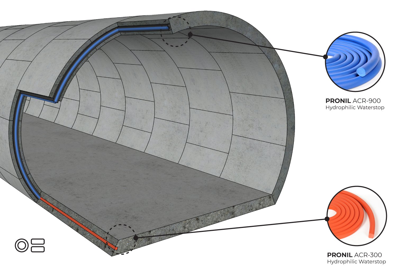 In tunnel construction, PRONIL ACR-900 and ACR-300 hydrophilic waterstops are placed at segment joints to block water ingress. These expandable seals activate when exposed to moisture, ensuring the joints between tunnel segments remain watertight. This application enhances structural durability and prevents leakage in underground tunnel environments.