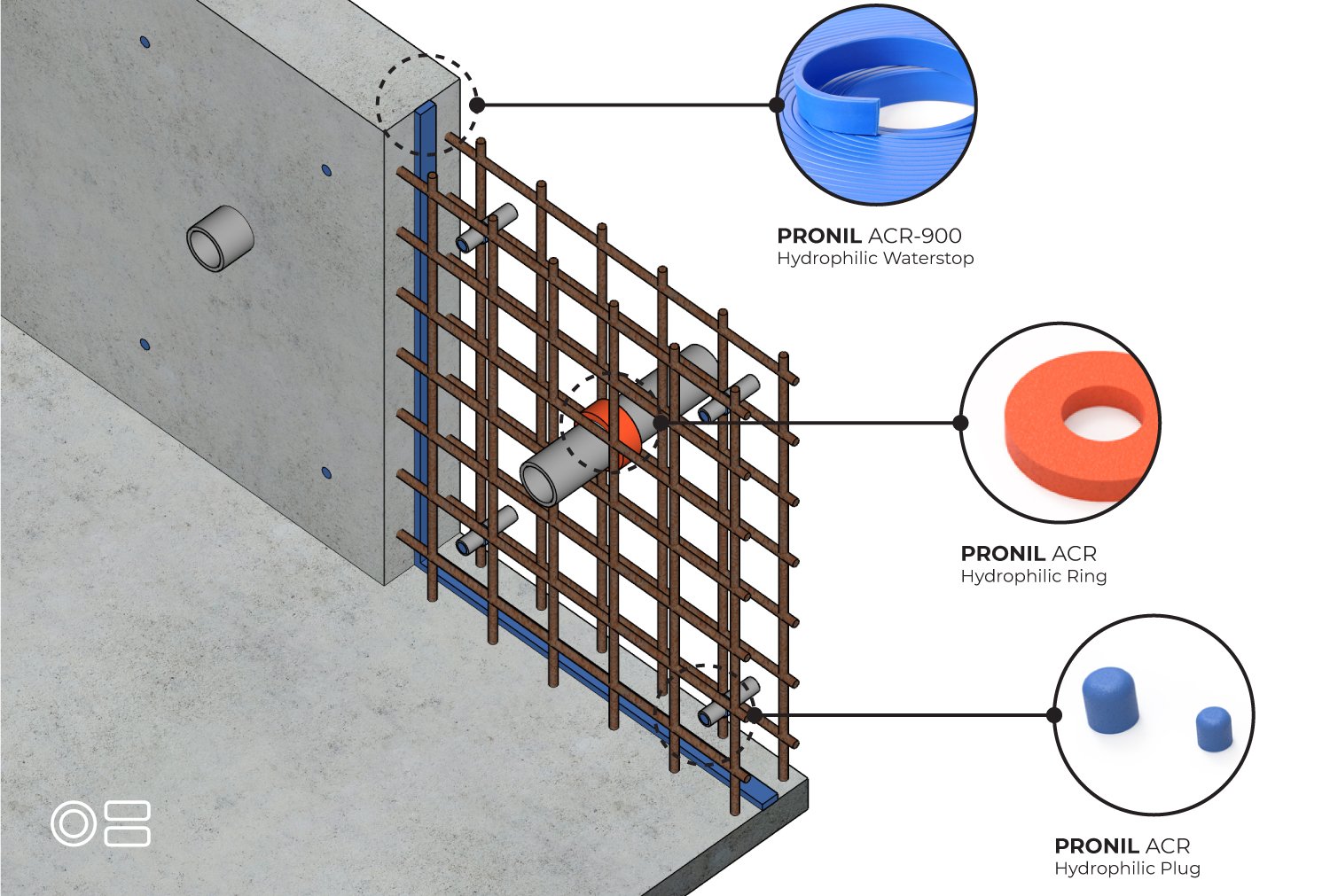 This system uses PRONIL ACR-900 hydrophilic waterstop installed along construction joints to prevent water infiltration through concrete walls. Additionally, hydrophilic rings and plugs are applied around pipe penetrations to ensure complete sealing. The materials expand on contact with water, providing long-lasting waterproof protection for wall structures.